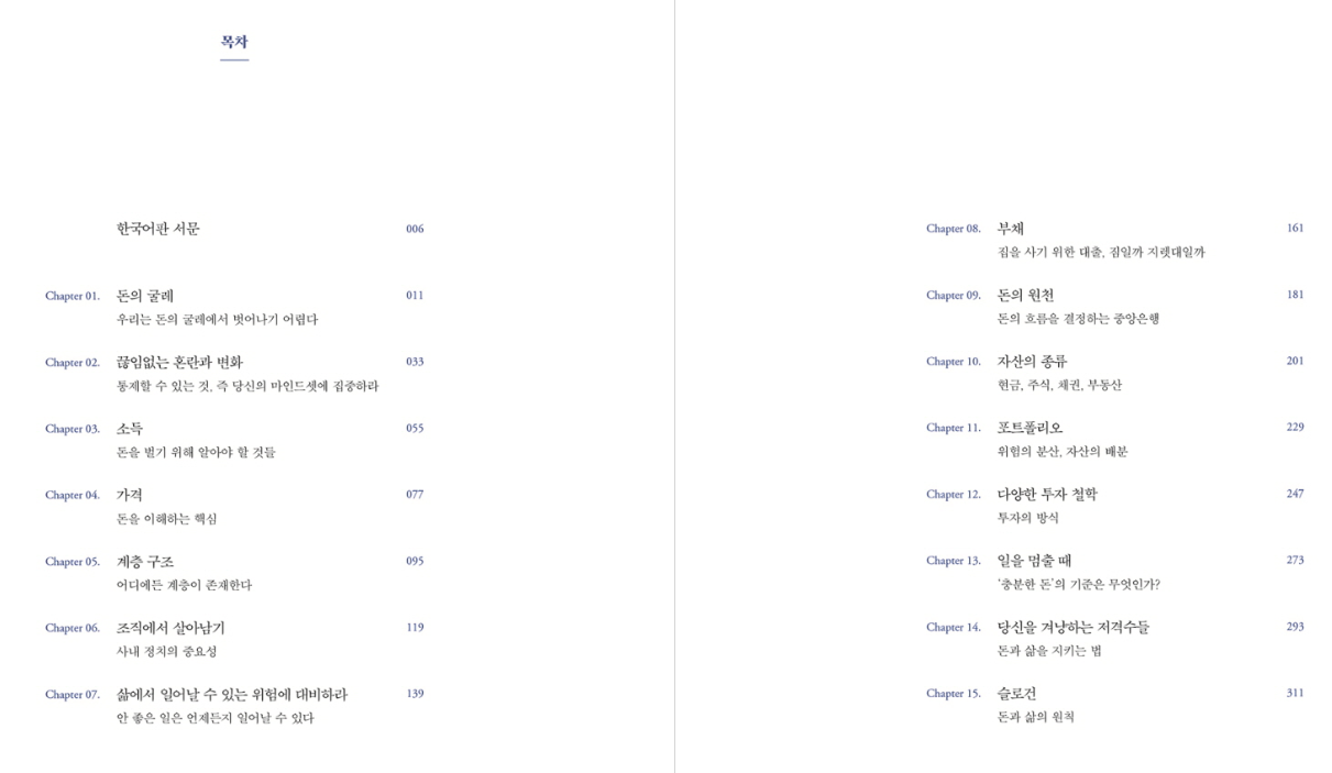 『부의 전략 수업』은 총 15개의 챕터로 구성돼 있어요. 하지만 단순히 챕터 수를 나열한 구성에 그치지 않고, 각 챕터는 실제 생존 전략처럼 다가와요. 예를 들어 ‘감정적 소비 통제하기’, ‘시장 흐름에 휘둘리지 않는 사고법’, ‘리스크를 계산하는 습관’, ‘균형 있는 포트폴리오 설계’ 등은 바로 실생활에 적용할 수 있는 전략들이에요.