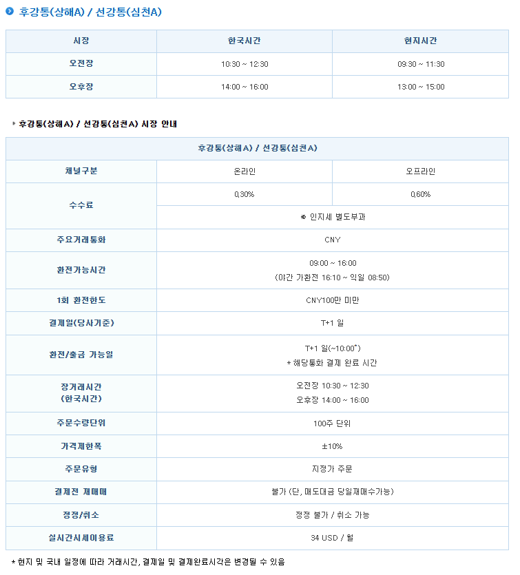 - 중국 본토 거래소(상하이A, 선전A)는 오전 10시 30분부터 오후 4시까지 운영되며, 점심시간에는 휴장합니다.