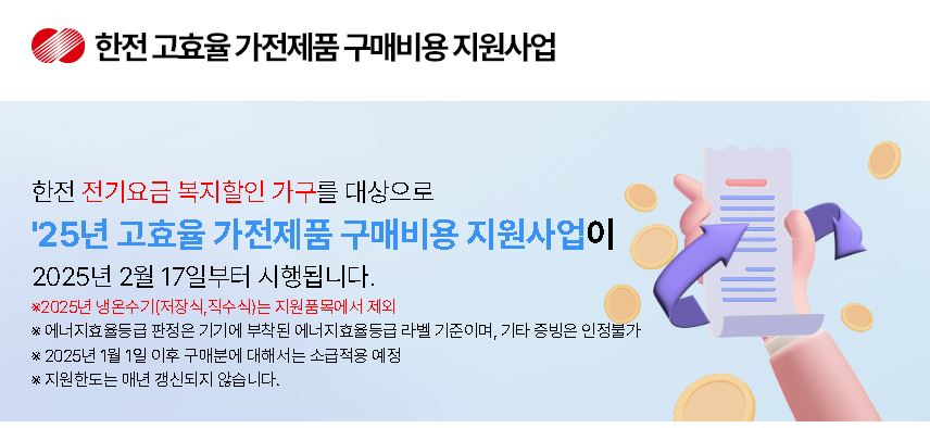 기존에는 복지할인가구만 신청이 가능했던 제도였죠. 2025년에도 한전은 전기요금 복지할인가구를 대상으로 1등급 가전제품을 구매할 경우 최대 30%까지 환급해주고 있어요. 특히 이 환급은 계좌로 직접 입금되는 방식이라 실질적인 혜택 체감이 크답니다.