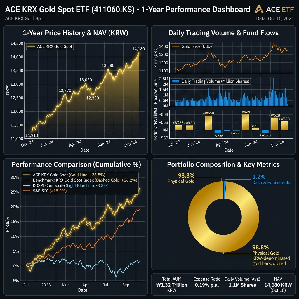 ETF는 일반 기업의 재무제표가 아닌 펀드 운용 지표로 분석합니다. ACE KRX금현물의 핵심 지표를 살펴보겠습니다.