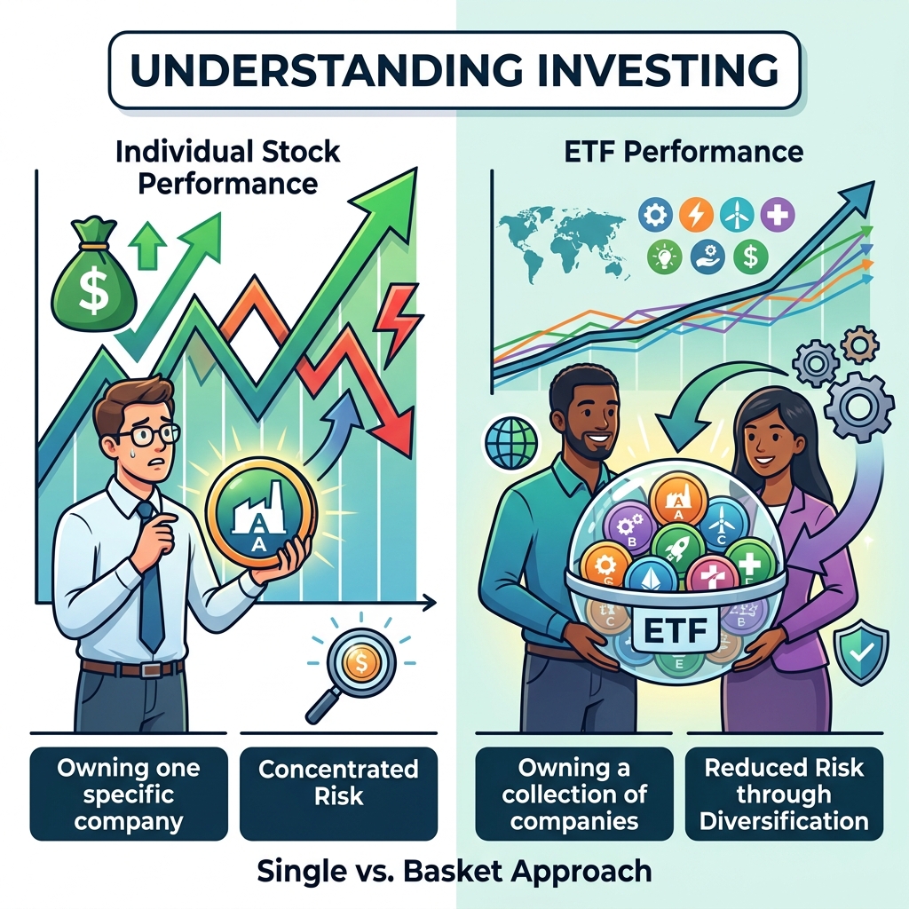 • ETF는 여러 주식을 한 바구니에 담아 주식처럼 거래하는 상품 — 소액으로 분산 투자가 가능합니다.